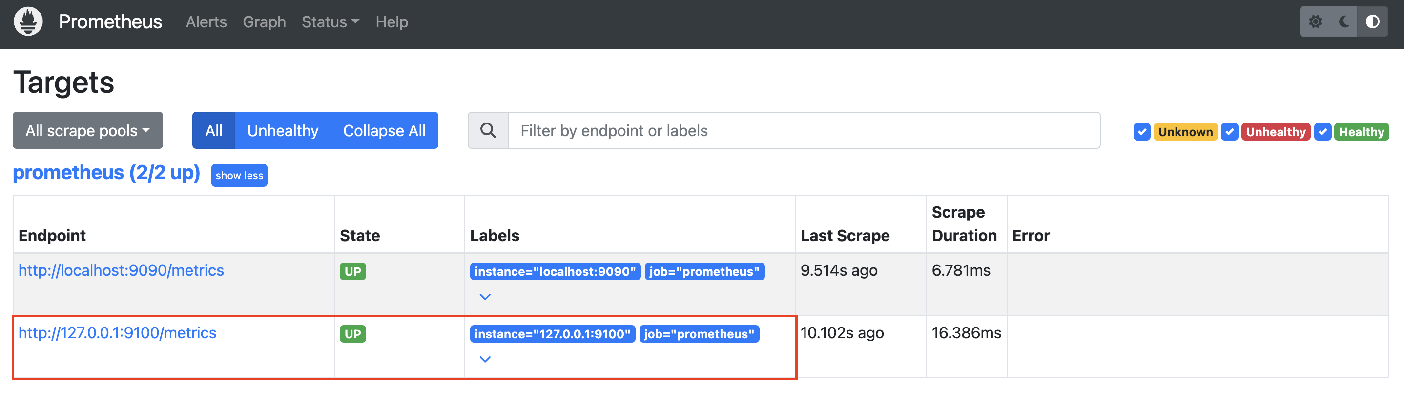위 화면에서 상단의 status -> targets를 들어가면 우리가 추가한 엔드포인트로 정상적으로 데이터를 수집하고 있는 것을 확인할 수 있습니다.