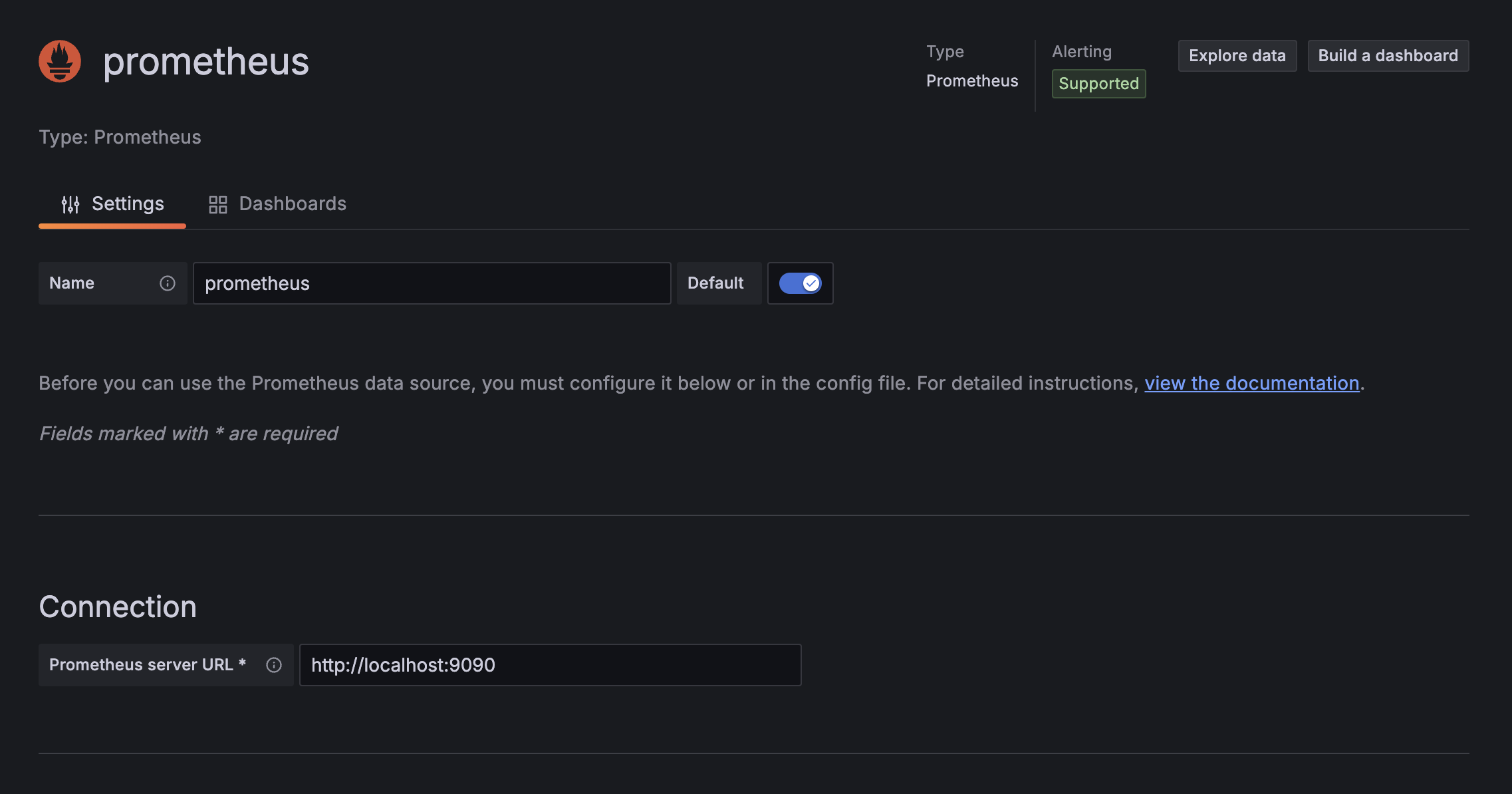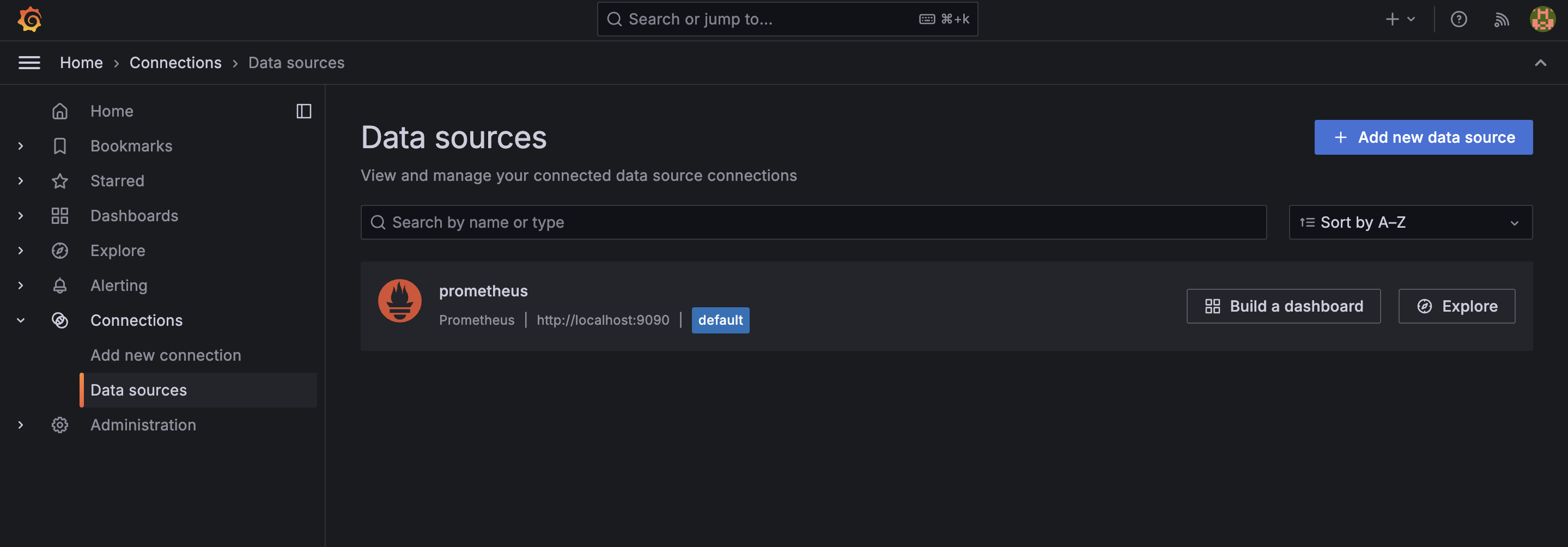 설정을 완료한 후 다시 사이드바에서 connections -> data sources를 들어가면 아래처럼 prometheus가 등록된 것을 확인할 수 있습니다.