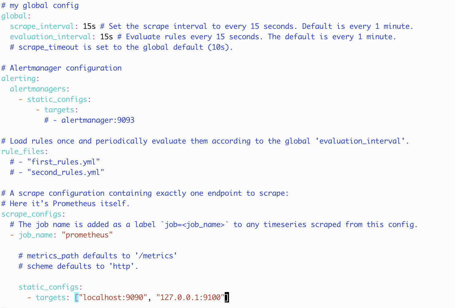 scrape_configs -> static_configs -> targets에 "127.0.0.1:9100"을 추가하여 설정 파일이 아래처럼 구성되도록 합니다. 127.0.0.1:9100은 node exporter의 엔드포인트입니다.