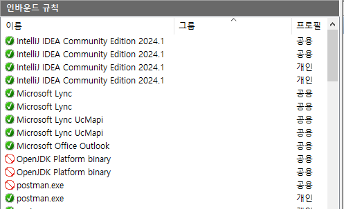 해당 설정은 설정 -> 업데이트 및 보안 -> Windows 보안 -> 방화벽 및 네트워크 보호 -> 고급설정 -> 인바운드 규칙에서 확인할 수 있습니다.